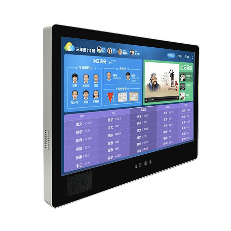 电子班牌,又称智慧班牌,是一种安装在教室门口的智能交互终端显示设备。是通过高清可视化和互动功能,在各个班级展示考勤信息、授课信息等,有18.5寸和21.5寸可选